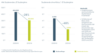 Die Entwicklung der Absolventenzahlen kann mit der äußerst positiven Entwicklung der Anfängerzahlen allerdings nicht mithalten. Dies kann ein Indiz für eine hohe Zahl von Studienabbrechern sein. Derzeit gibt es keine Statistiken zum Studienerfolg von beruflich Qualifizierten, erst diejetzt geplante Einführung von Studienverlaufsstatistiken könnte diese Wissenslücke schließen. Deshalb lässt sich der Studienerfolg in dieser Gruppe nur näherungsweise taxieren, sieht man einmal von Erhebungen einzelner Hochschulen über ihre Studierenden ab. Eine Überschlagsrechnung zeigt, dass im Verhältnis zu den Studienanfängern viel zu wenig beruflich Qualifizierte den Studienabschluss erreichen. Legt man eine Studienzeit von sechs bis acht Semestern zugrunde und stellt die durchschnittliche Anzahl der Studienanfänger ohne Abitur der Studienjahre 2009 und 2010 der durchschnittlichen Anzahl der Absolventen ohne Abitur der Studienjahre 2013 und 2014 gegenüber, so erreichen nur 40 Prozent der Studierenden ohne Abitur einen Abschluss. Selbst wenn in diese Rechnung nicht einfließt, dass es in der Studierendengruppe der beruflich Qualifizierten einen überdurchschnittlich hohen Anteil an Teilzeitstudierenden gibt, der länger studiert – der Unterschied zu den Studierenden insgesamt ist deutlich.