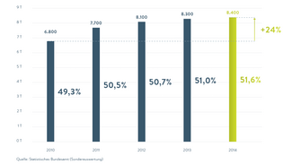 Trotz der insgesamt schwachen Entwicklung hält das Handlungsfeld Chancengerechte Bildung eine Erfolgsgeschichte in Sachen Diversität bereit: Der Frauenanteil der studierenden Bildungsinländer steigt seit 2010, und zwar kontinuierlich. In der Gruppe der Bildungsinländer machen Frauen im Jahr 2014 mit 8.400 Personen 51,6 Prozent der Erstsemester aus. Dies entspricht einem Anstieg von 24 Prozent seit 2010. Zu dieser Zeit waren es noch 6.800 Bildungsinländerinnen im ersten Hochschulsemester. Der Frauenanteil unter Bildungsinländern im ersten Hochschulsemester übersteigt damit sogar jenen der deutschen Studierenden, welcher mit 49,7 Prozent im Jahr 2014 knapp zwei Prozentpunkte darunter lag.